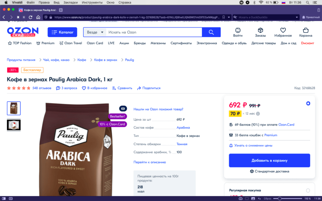 Я не знаю внутренних алгоритмов «Озона» (это коммерческая тайна) и поэтому не могу утверждать наверняка, что именно наличие и отсутствие cookies является решающим фактором для выставления цены. Но несколько экспериментов, проведенных на разных случайных товарах, показали: именно в приватном режиме браузера сайт предлагает самую выгодную цену. То есть лучшее — незнакомцам. Так что первое, что стоит сделать перед покупкой, — открыть приватное окно в браузере (обычно это делается через соответствующий пункт в меню), скопировать ссылку на товар туда и посмотреть, стала ли его стоимость лучше.