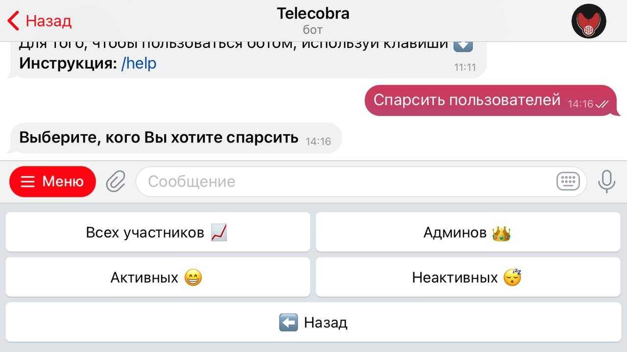 Бесплатный @ParserFree2Bot анализирует данные открытых чатов. Чтобы получить список участников, активных пользователей и «собачек», в поле для написания сообщения нужно вставить ссылку на группу. Аналогичные функции реализованы в @Telecobrabot. Я чаще использую этот парсер, т.к. результаты удобно сохранять – в csv-файл.