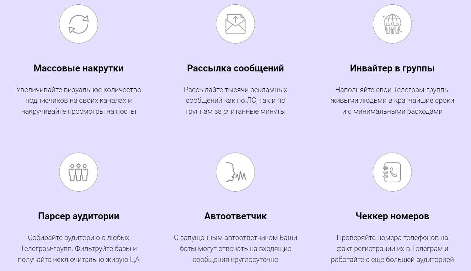 Telegram Soft. Парсер собирает и сортирует контакты, проверяет номера телефонов на предмет регистрации в Телеграм, делает массовые рассылки. С его помощью можно привлечь в группу только активных пользователей, исключив ботов.