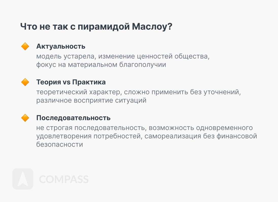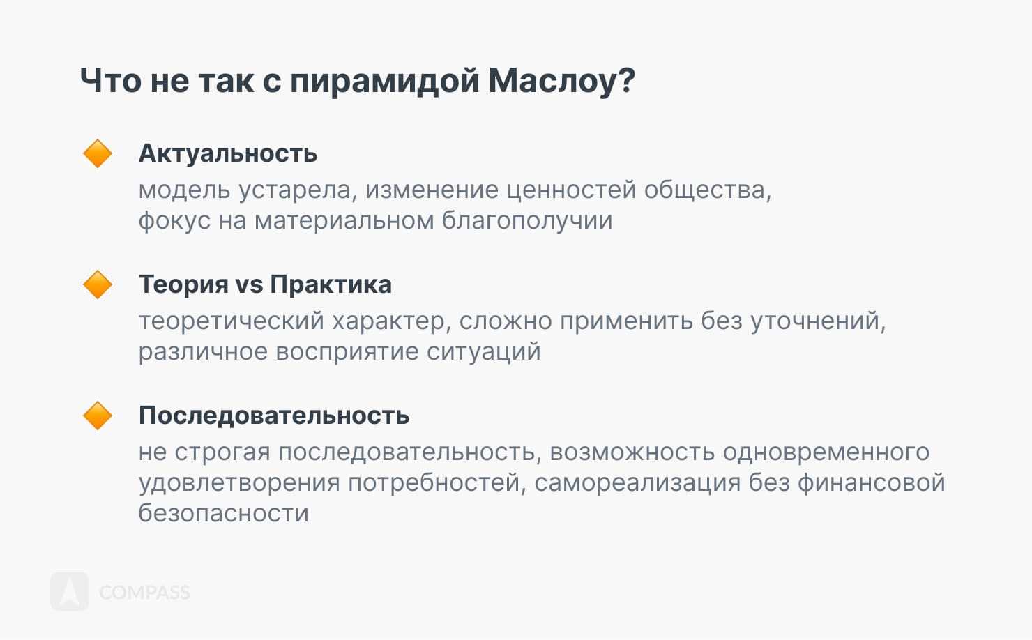 Пирамида Маслоу была одной из ранних попыток изучить систему потребностей и мотивации людей. Однако даже у этой концепции есть свои недостатки: