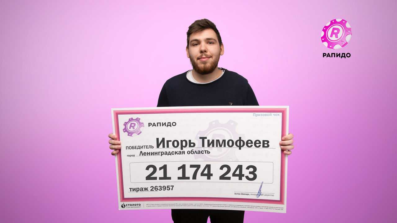 «Отец купил билет поздно ночью» Билет 263957-го тиража гослотереи «Рапидо», который впоследствии принес победу, купил отец Игоря Тимофеева*. На оформление выигрыша в лотерейный центр в Москву победитель попросил приехать сына. «Лотерейный билет папа купил поздно ночью в мобильном приложении «Столото». В тот день он сильно устал и никак не мог уснуть. Открыл мобильное приложение «Столото», отметил числа в билете наугад, ни на что особо не надеясь. Возможно, из-за этого удача ему и улыбнулась», – размышляет Игорь. Тиражи лотереи «Рапидо» проходят каждые 15 минут, поэтому о выигрыше победитель узнал почти сразу после розыгрыша.