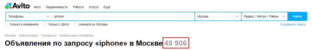 Вы сможете выяснить количество объявлений по товару, который предлагаете, если введете его заглавие в строчку поиска. Принципиально задать регион, в каком вы предлагаете продукты. Цифра представлена на снимке экрана.