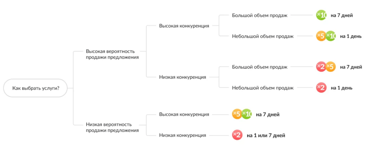 Чем меньше покупателей и чем тщательнее они обдумывают покупку, тем дольше должна действовать услуга. Если товар недорогой, а спрос на него массовый и люди недолго принимают решение о покупке — подойдут услуги на один день. Если товар необычный или с высокой ценой, из-за чего людям может понадобится больше времени на раздумья, выбирайте услугу на семь дней.