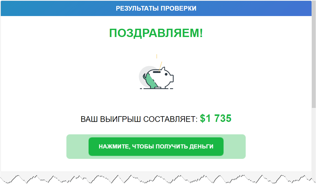 На сайте, на который вы перешли, дабы получить выигрыш, вас встретит яркое сообщение. В данном сообщении вас поздравляют с выигрышем.
