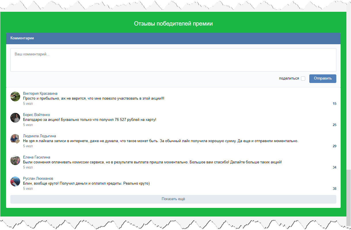 Чуть ниже вы увидите кнопку, название которой однозначно намекает на получение выигрыша, необходимо только её нажать. Причём не увидеть её сложно, ко всему прочему она может ещё и пульсировать. Согласитесь, трудно пропустить этот элемент – сделано абсолютно всё, дабы его было заметно, и посетитель таки нажал на данную кнопку. А если прокрутите ещё ниже, то увидите восторженные отзывы счастливчиков, которые также получили выигрыш.