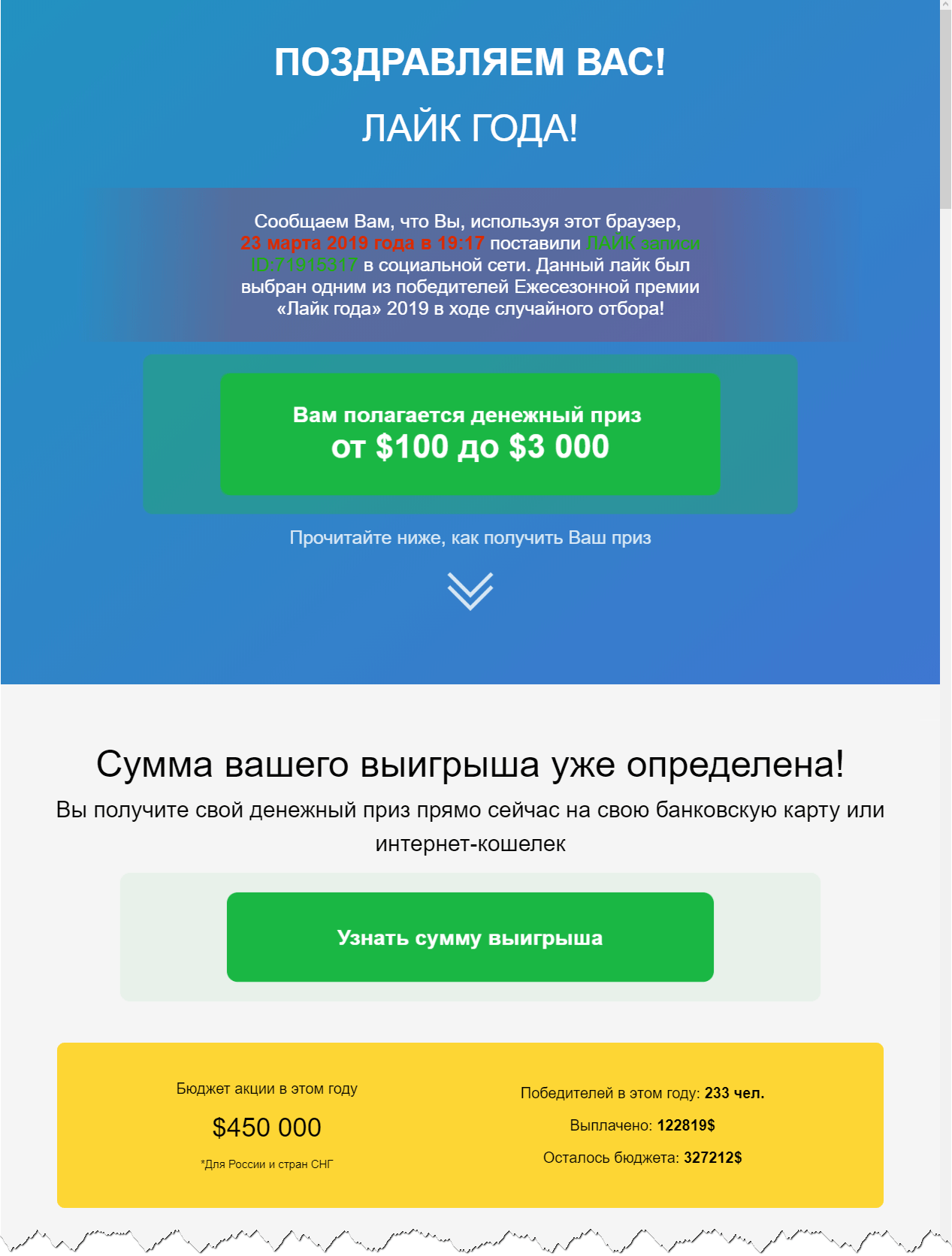 Создатели этих мошеннических сообщений о выигрышах достаточно уверенно и безнаказанно себя чувствуют, продолжая облапошивать добропорядочных граждан. Ранее это были объявления о опросах за деньги, о чём можно прочесть в материале «Самый грандиозный опрос 2020 года – что это: обман, лохотрон, разбираемся», а теперь новый тренд – выигрыш за поставленный лайк и множество созданных под это дело сайтов, имеющих различный дизайн, текстовое наполнение, но преследующие исключительно одну цель – нажиться на переводящих деньги, которые надеются получить мифический выигрыш.