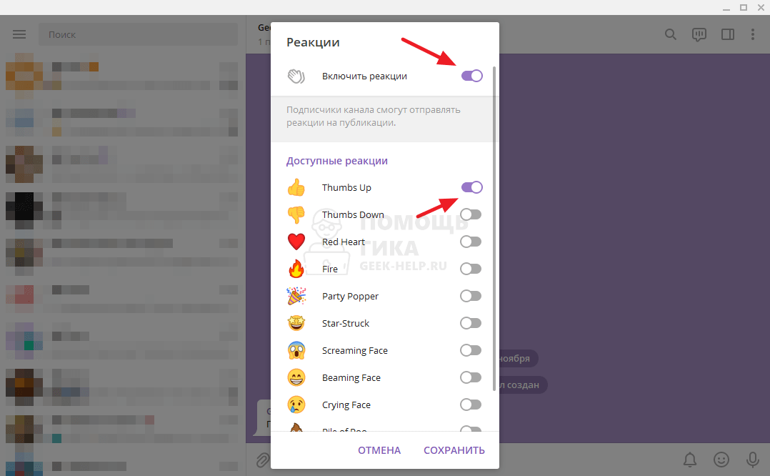 Если нужно полностью отключить реакции, деактивируйте переключатель “Включить реакции”.