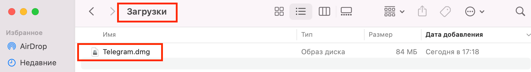 После того как мессенджер скачается на компьютер, заходим в папку «Загрузки» и кликаем два раза на строчке Telegram.dmg.