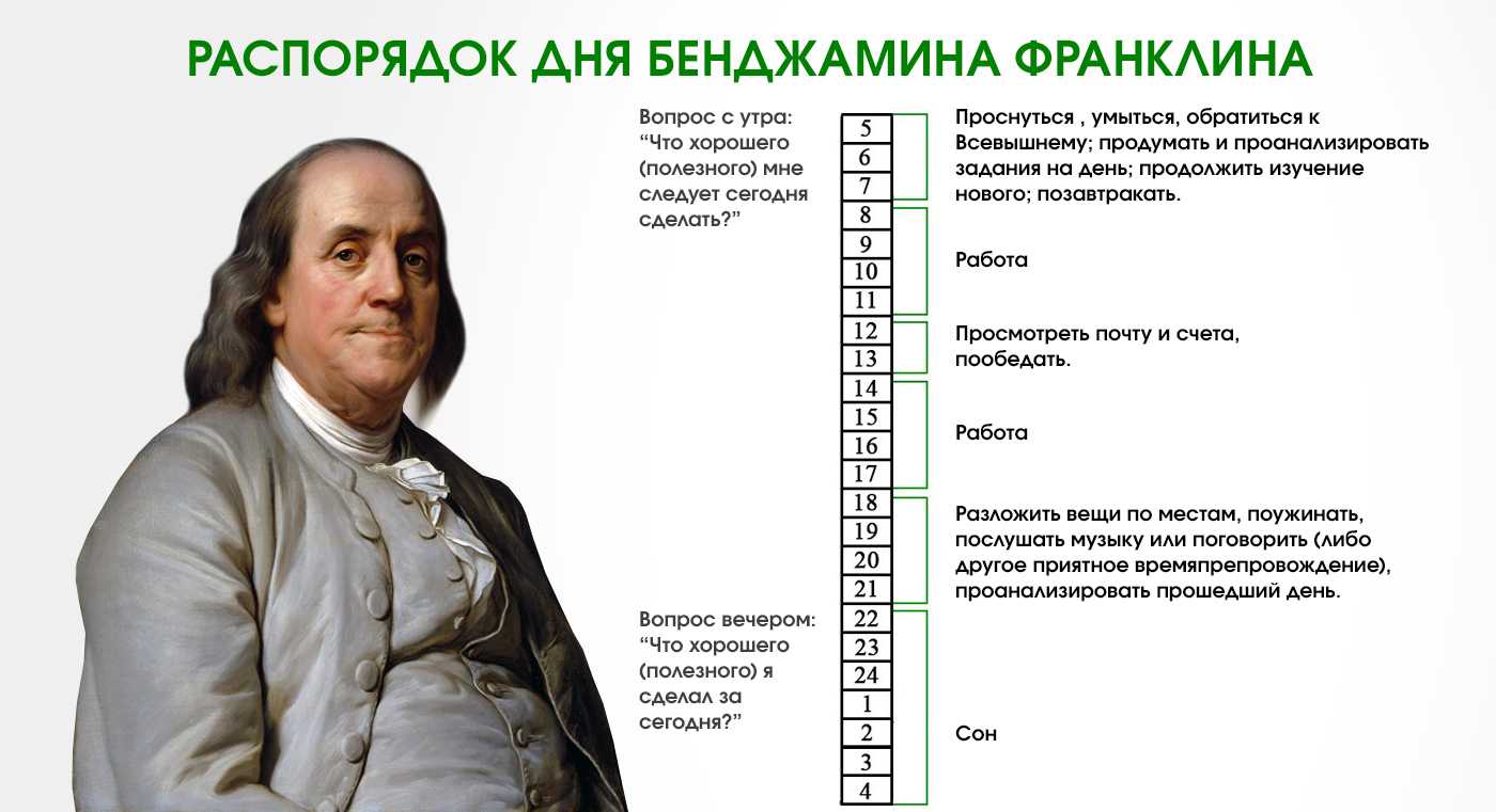 Ранний подъем и планирование позволяло входить в тонус и быть впереди всех. Франклин стремился к совершенству, для этого он создал специальную программу, которая называлась «13 добродетелей Франклина».