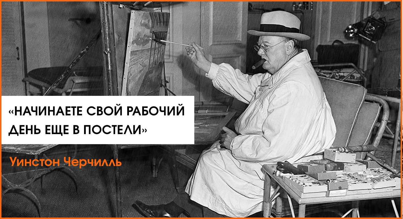 Уинстон просыпался в 07:30. Но целых 2 часа он обычно проводил в постели. Он говорил: «Начинайте свой рабочий день еще в постели». Он завтракал в постели, в постели читал последние новости и давал поручение секретарше.