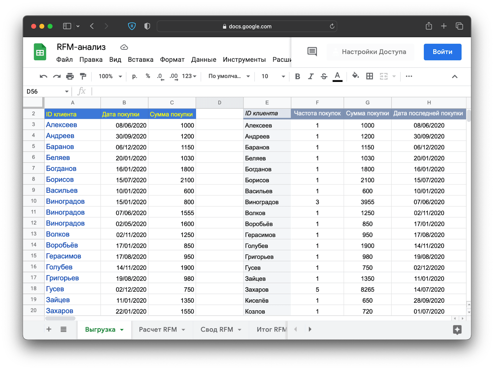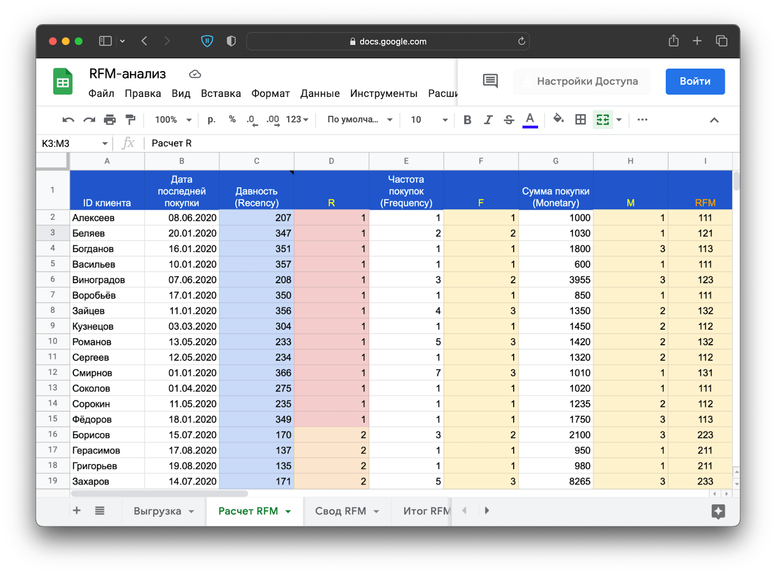 К преимуществам РФМ-анализа относится быстрота и легкость проведения: в качестве инструмента могут использоваться даже Excel или Google Таблицы — главное, чтобы клиентская база без проблем выгружалась из вашей CRM-системы. Если объем базы слишком велик, стоит обратиться к специальным сервисам, заточенным на клиентский анализ (customer analysis).