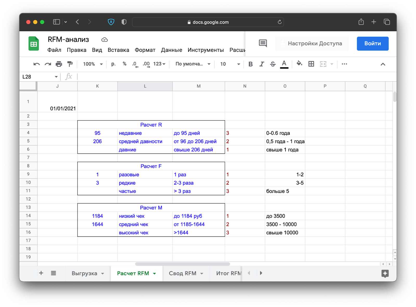 У каждой компании будут свои показатели давности, частоты покупок и среднего чека, но обычно у всех предпринимателей есть эти данные.