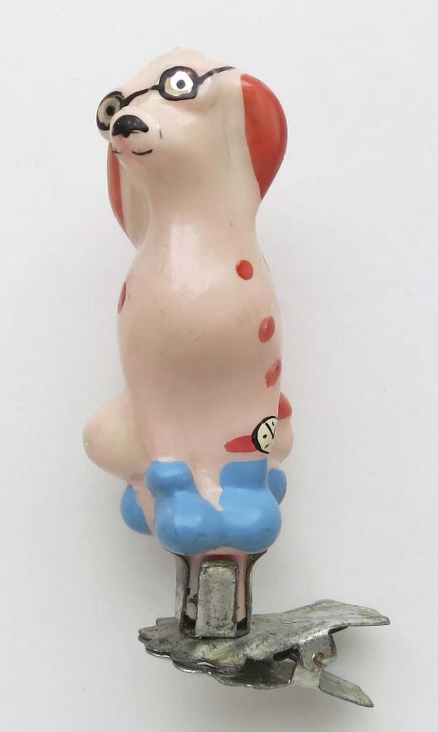Стекло — фигурка задумчивого животного в очках. Порода — по внешнему виду — далматин. На левой лапке нарисованы наручные часы. На елку водружалась с помощью прищепки. Начальная стоимость — от 60 тыс. руб., но один из экземпляров «ушел» за 330 000.