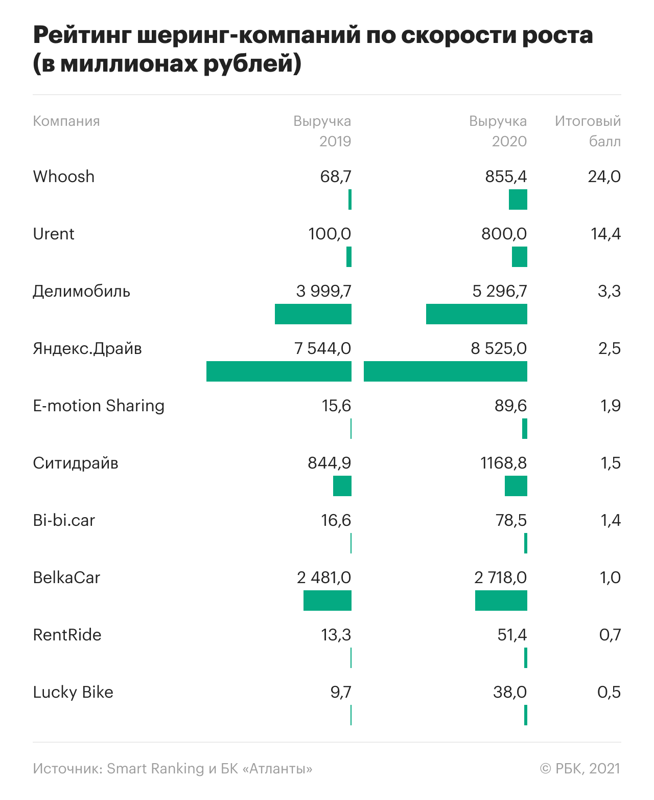 Основная конкуренция за рынок кикшеринга разворачивается между Whoosh и Urent. Они и стали лидерами по динамике роста среди транспортных шеринг-компаний, рассчитанной по формуле Smart Ranking. Обе компании называют себя лидерами своего рынка, обе отметили, что скачок спроса в 2020 году подстегнула пандемия.