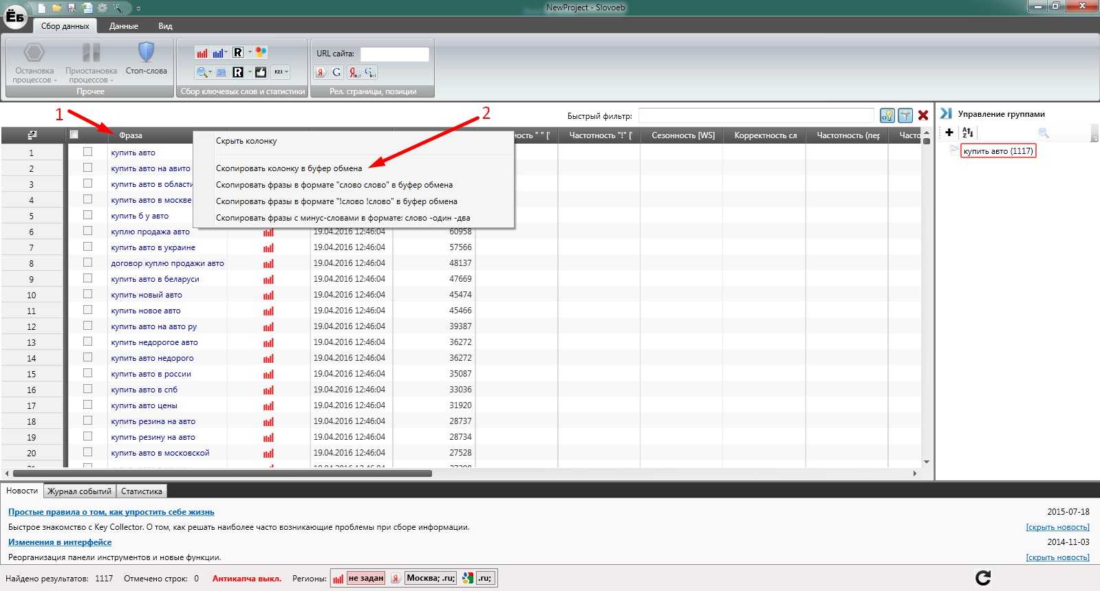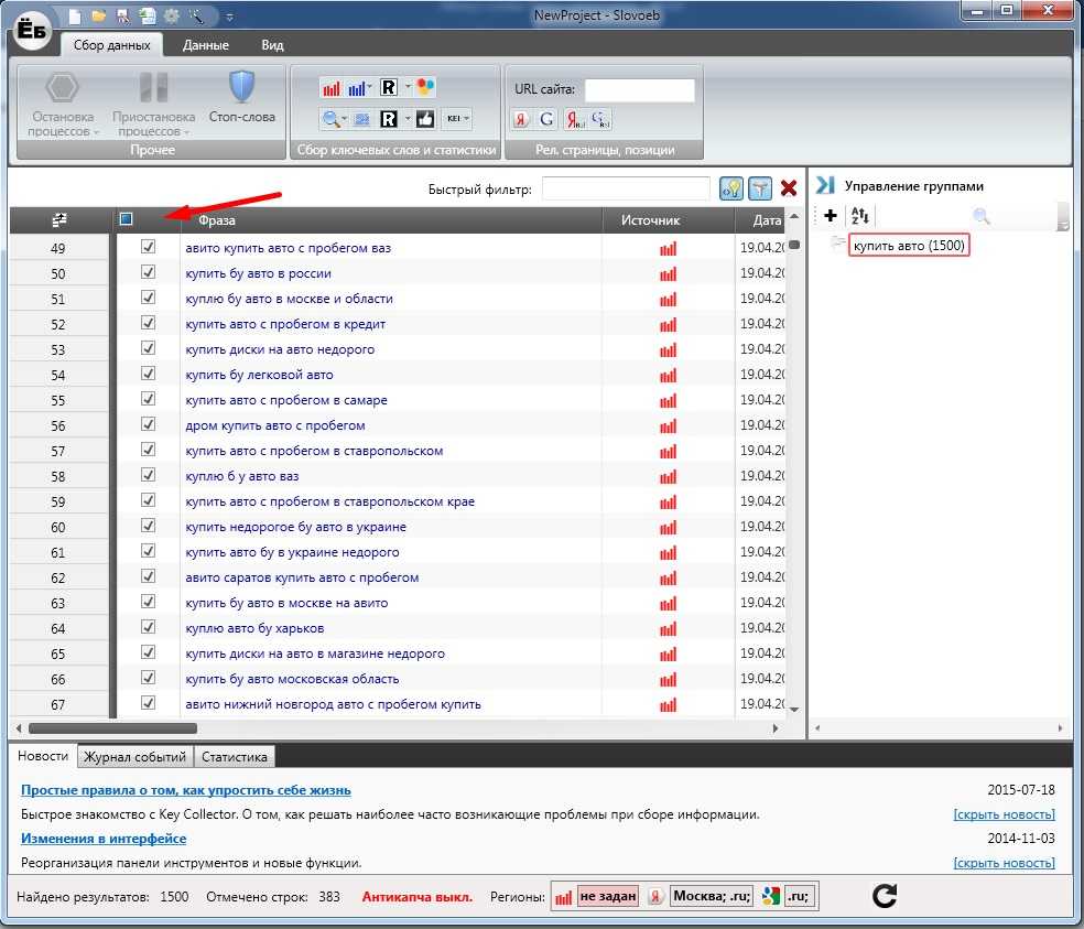 - Нажимаем на заголовок таблицы «Фраза» для того, чтобы отсортировать список запросов по алфавиту.