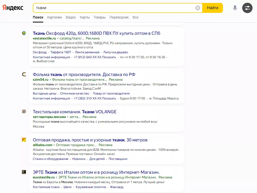 При этом с высокочастотными лучше быть аккуратнее — по ним часто много нерелевантного спроса, или конкуренция оказывается слишком высокой. Тот же высокочастотный запрос «ткани для верхней одежды» на первый взгляд отлично подходит для рекламы — соответствует ассортименту нашего магазина, а в выдаче сплошь коммерческие объявления: