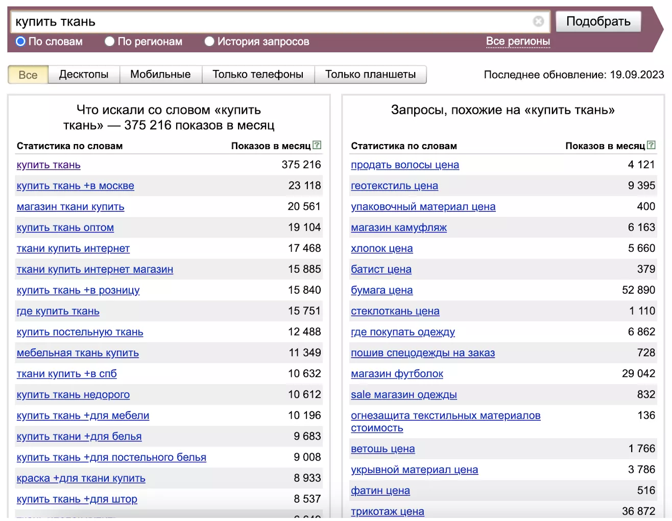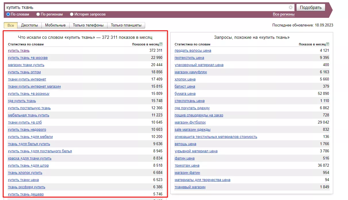 Вордстат показывает две колонки. Слева приводится список запросов, которые пользователи искали вместе с введённым «купить ткань». Правая колонка показывает, что еще интересовало людей, которые вводили наш запрос. Представленные фразы похожи по теме на введённый запрос, но состоят из других слов.