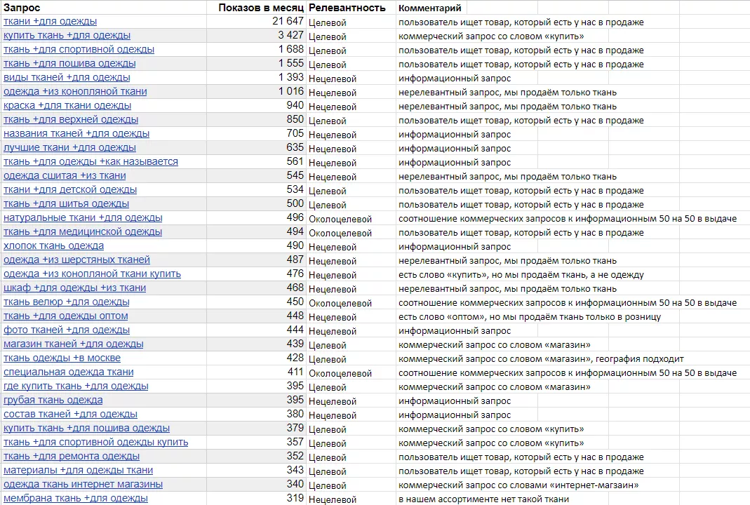 Околоцелевые запросы. Это пограничные запросы, которые напрямую не связаны с намерением пользователя «купить», но при этом перекликаются с общей тематикой — что-то среднее между коммерческими и информационными. Примеры таких: «ткань велюр для одежды», «специальная одежда ткани», «натуральные ткани для одежды».