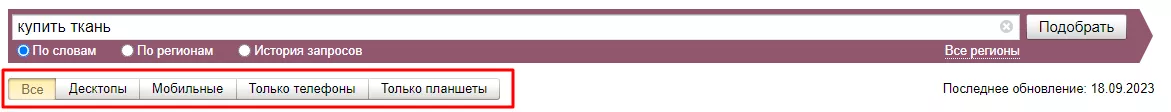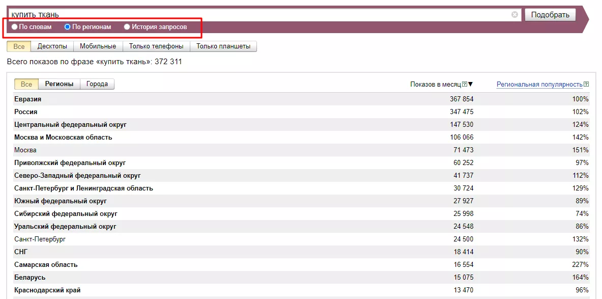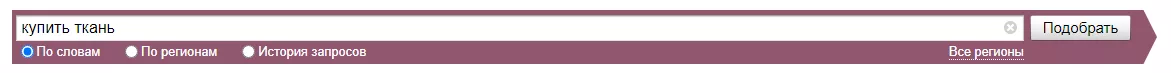 Чтобы получить статистику, необходимо ввести ключ в строку поиска. Вбивать каждую словоформу по отдельности не нужно — сервис сам понимает различия в числах и падежах. Поэтому без разницы как написать — «купить ткань» или «купить ткани» — результат будет один и тот же.