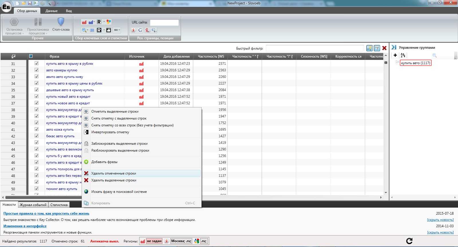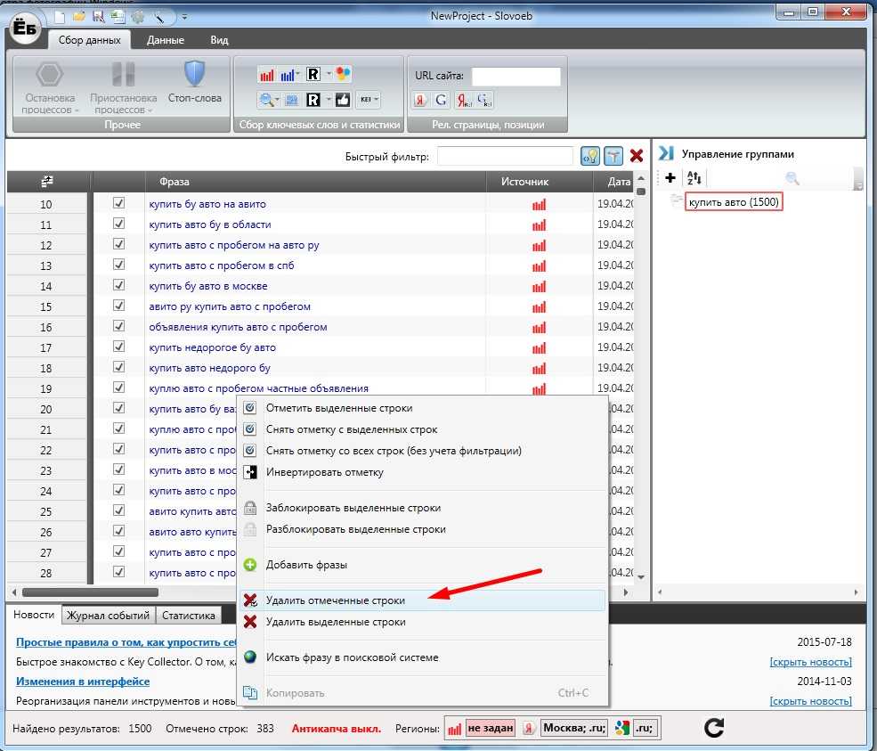 Чтобы автоматически расставить плюсы с ключевыми словами, выберите ключи галочками, и нажмите вкладку «Изменить» и дальше — «Изменить ключевые слова»