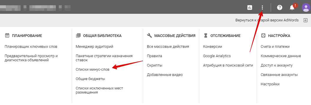 Перейти к настройке списков минус-слов можно через меню в правом верхнем углу экрана, и найдя там Общую библиотеку.