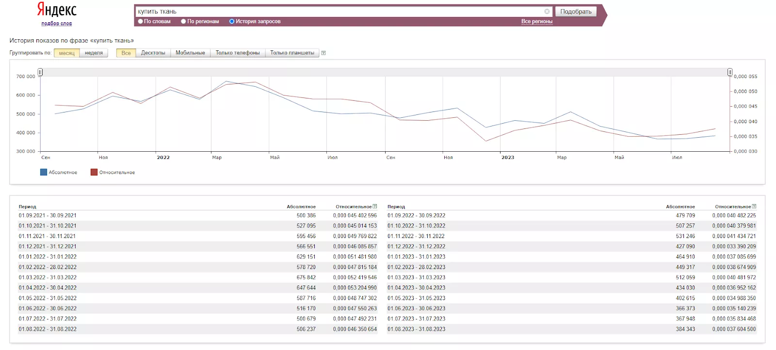 Например, благодаря истории показов можно выяснить, что спрос на покупку тканей в течение года примерно одинаковый