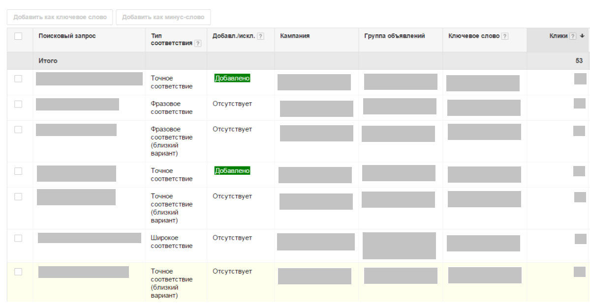 Обратите внимание, что показатели в столбце «тип соответствия» отражает, насколько ключевое слово соотносится с пользовательским запросом, который вызвал показ объявления. Таким образом, если вы используете объявление с ключом душевые кабины и широком соответствием, а пользователь ввел в поиске душевые кабины, то в отчете отразится «точное соответствие (говорит о том, что запрос и ключ полностью совпали). Если вы найдете запросы, которые приносят вам переходы, добавьте их в список ключевых слов
