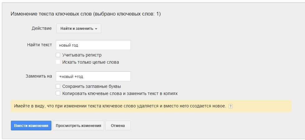 Обратите внимание на предупреждение: старое ключевое слово будет фактически удалено, а его статистика останется с удаленным словом. 4.С помощью способа, описанного выше, нельзя изменить широкое соответствие на модификатор широкого соответствия. Чтобы автоматически расставить плюсы с ключевыми словами, выберите ключи галочками, и нажмите вкладку «Изменить» и дальше — «Изменить ключевые слова»