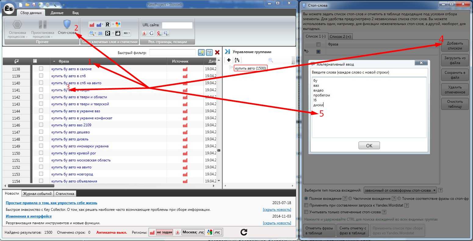 - Нажимаем «Стоп слова» и переносим окно стоп слов в правую сторону.