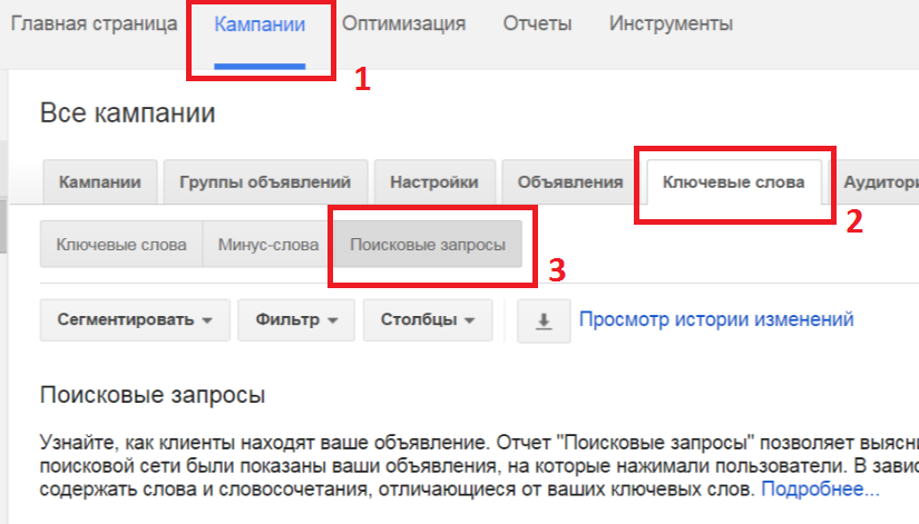 2.Анализировать эффективность ключевых фраз можно в отчете «Поисковые фразы» в AdWords. Он содержит все запросы, по которым показывалось ваша реклама. Чтобы начать с ним работу, перейдите по вкладке «Кампании», далее «Ключевые слова», «Поисковые запросы».