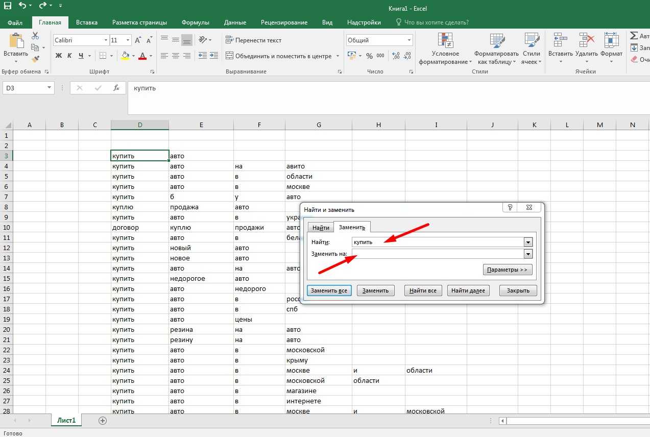 В первой строке вводите слова, которые стоят в ваших ключах, а во второй — на что нужно их заменить.