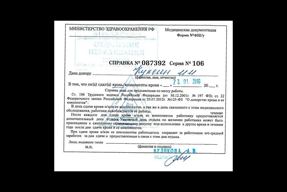 - Компенсация питания и выдача справки. Донор получает 1128 руб. (компенсацию питания) и справку, подтверждающую факт донации. На основании этой справки оформляются оплачиваемые дни отпуска.