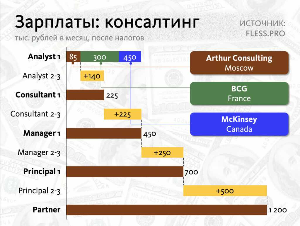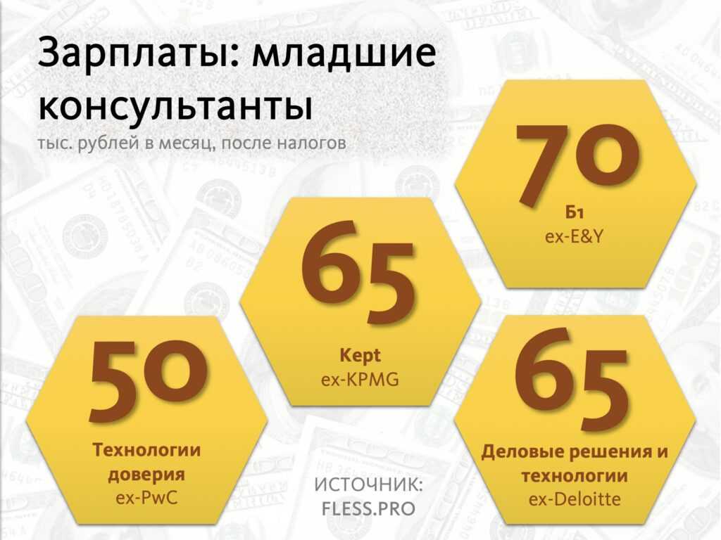 Зарплаты в Большой четверке – так себе. Но в нее несложно зайти, а после нее опыт продается отлично. Мой друг Афанасий после полугода в большой четверке сделал переход в другой консалтинг – так называемый второй эшелон.