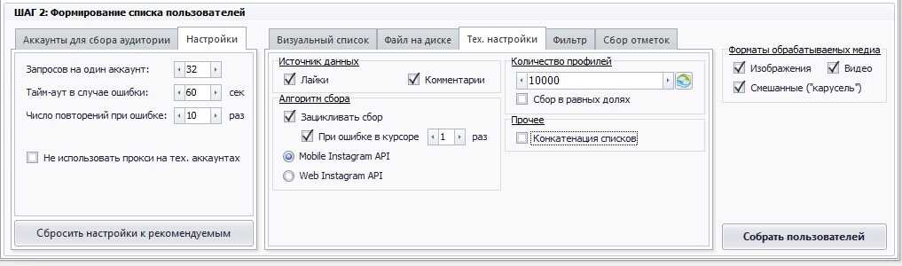 Затем в тех.настройках нужно настроить сбор именно тех, кто нам интересен: те кто ставит лайки или те, кто комментирует, или и те, и другие. А также задать необходимое количество пользователей, которых нужно собрать.