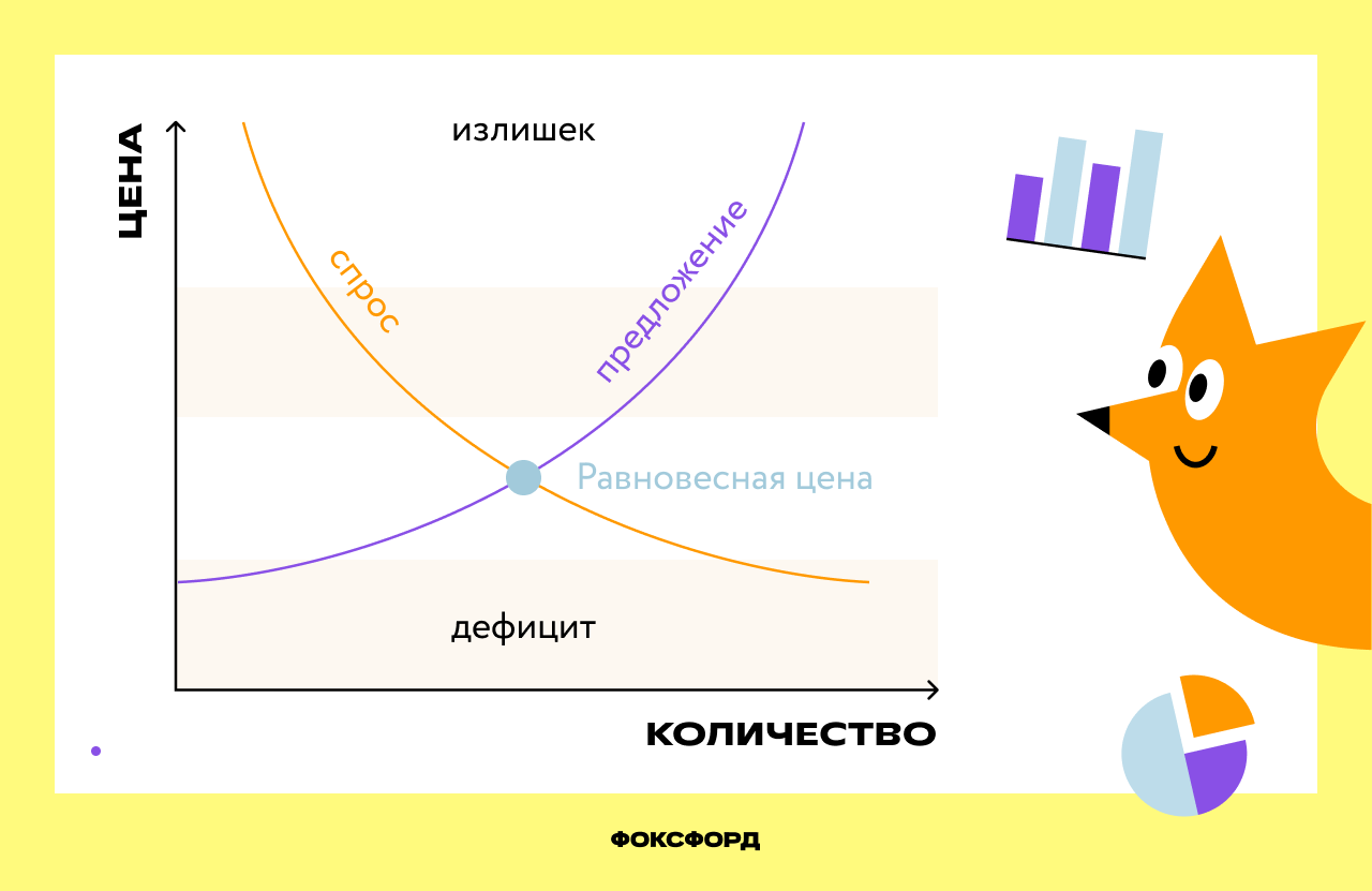 Если товара на рынке больше, чем нужно покупателям, — его цена падает, и продавцы могут разориться. Если число желающих приобрести товар превысит количество товара на рынке — возникает дефицит, и цена на товар увеличивается.