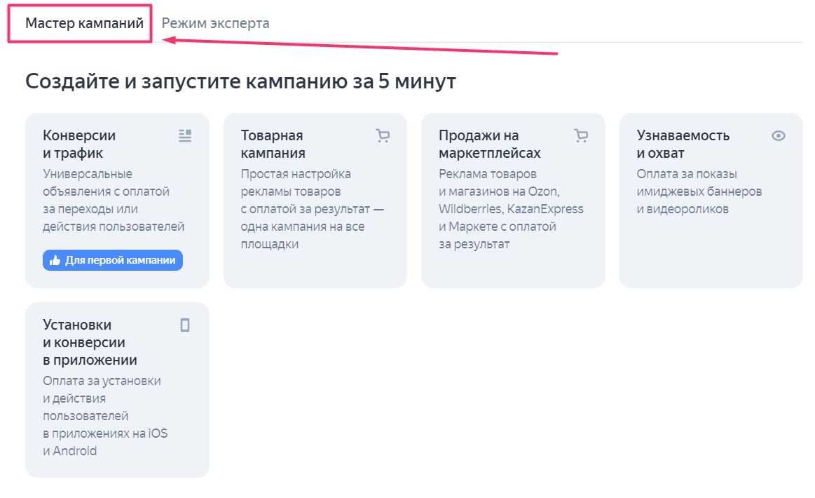 Это простой инструмент для быстрого запуска РК. В нем минимум ручных настроек и нет лишних заморочек, при этом все отлично работает. Поэтому если раньше вы не запускали контекстную рекламу и не хотите разбираться во всех ее тонкостях, смело выбирайте «Мастер кампаний».