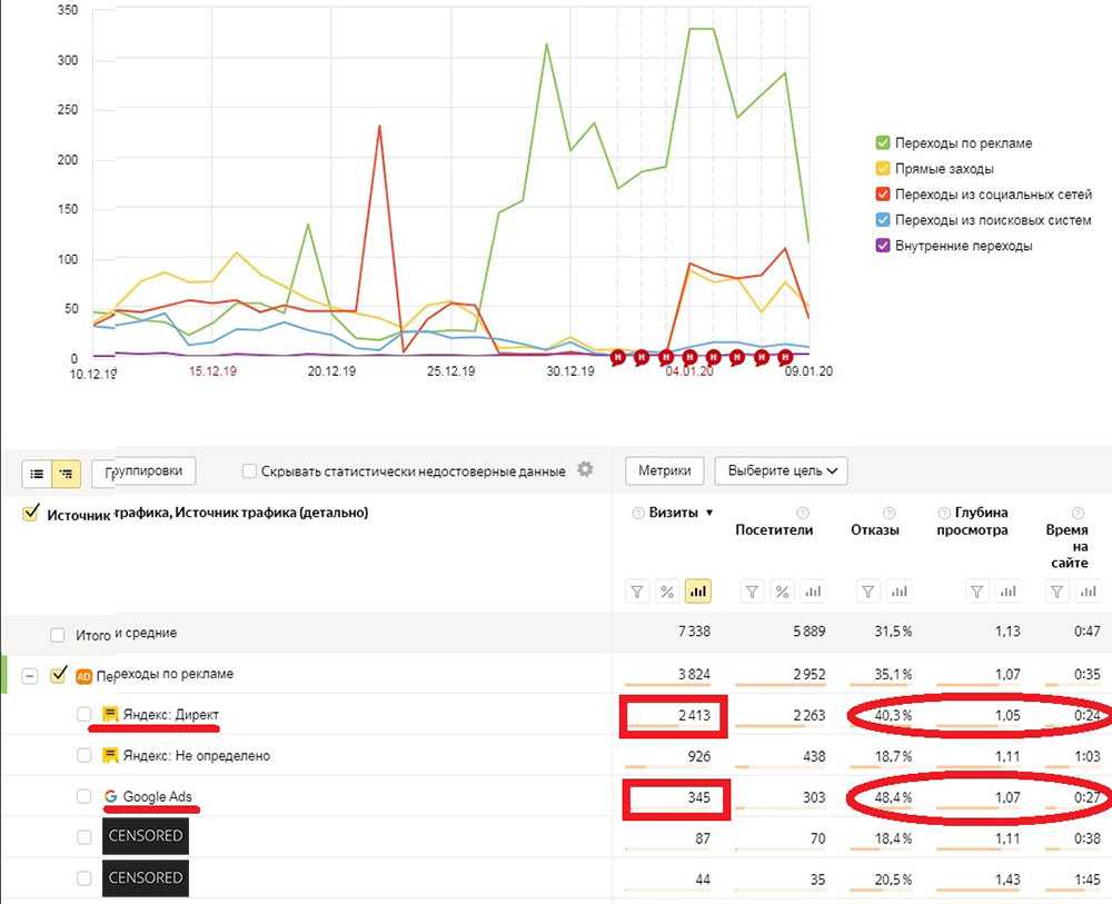 Как видим за месяц с декабря 2019-ого по январь 2020-ого трафик на сайт компании примерно равный с органического поиска и контекстных рекламных систем ЯНДЕКС и GOOGLE. То есть эффективность платного трафика с контекст не уступает чисто поисковому трафику. В ином случае бизнесмен не стал бы использовать дорогой контекстный трафик. И источники покупного трафика для компании по производству реечных потолков следующие: