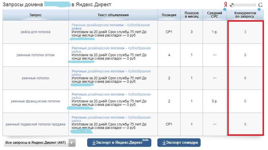 Нет, статистика показывает, что запросов в ЯНДЕКС чуть больше чем в ГУГЛ и такая разница в отпущенных бюджетах не по этой причине. Посмотрим может в ЯНДЕКС конкуренция меньше по тематическим запросам?