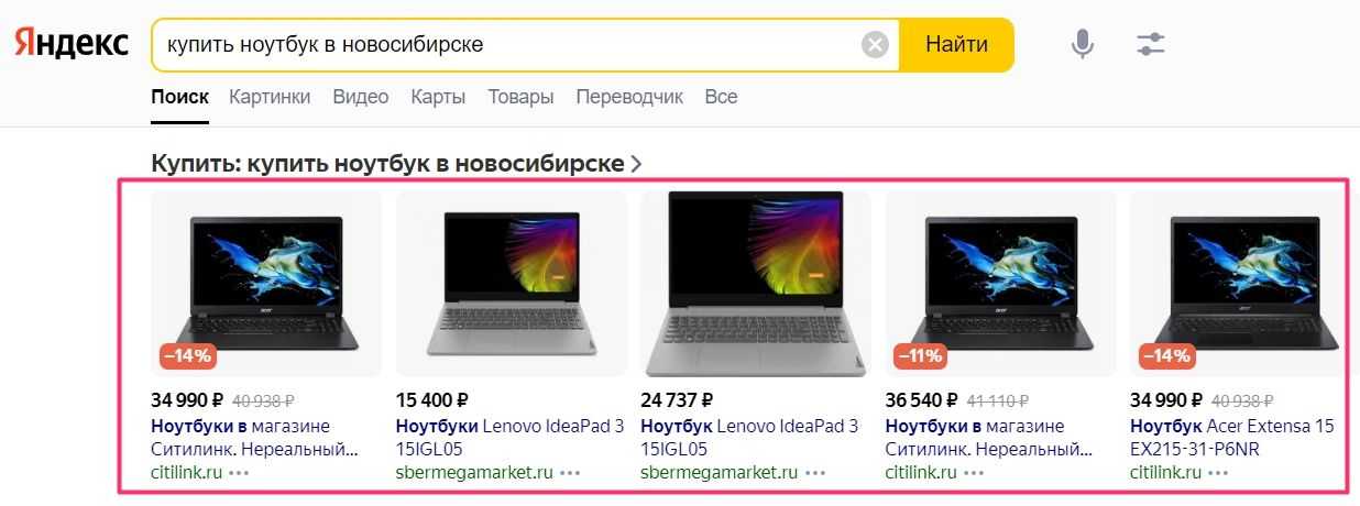 Пример товарной галереи в выдаче Яндекса