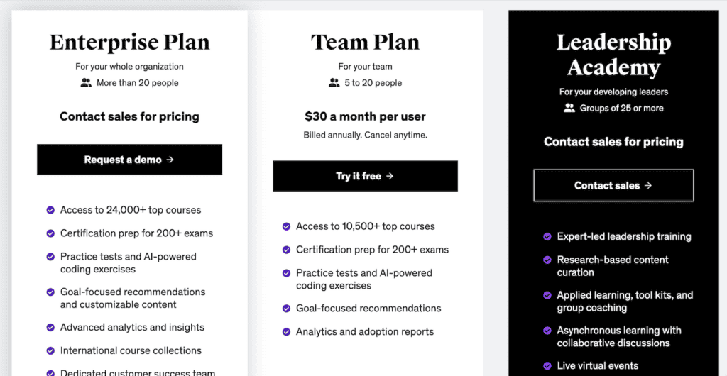 Udemy for Business offers the Enterprise, Team plan and Leadership Development Programs. The Team plan is for 5-20 users and costs $360 per user a year. The Enterprise plan is for 21 or more users, and you will need to contact sales for pricing. Both of these plans give you access to 14,000+ courses. The Leadership Development Program needs you to contact sales, where you can also request a demo.