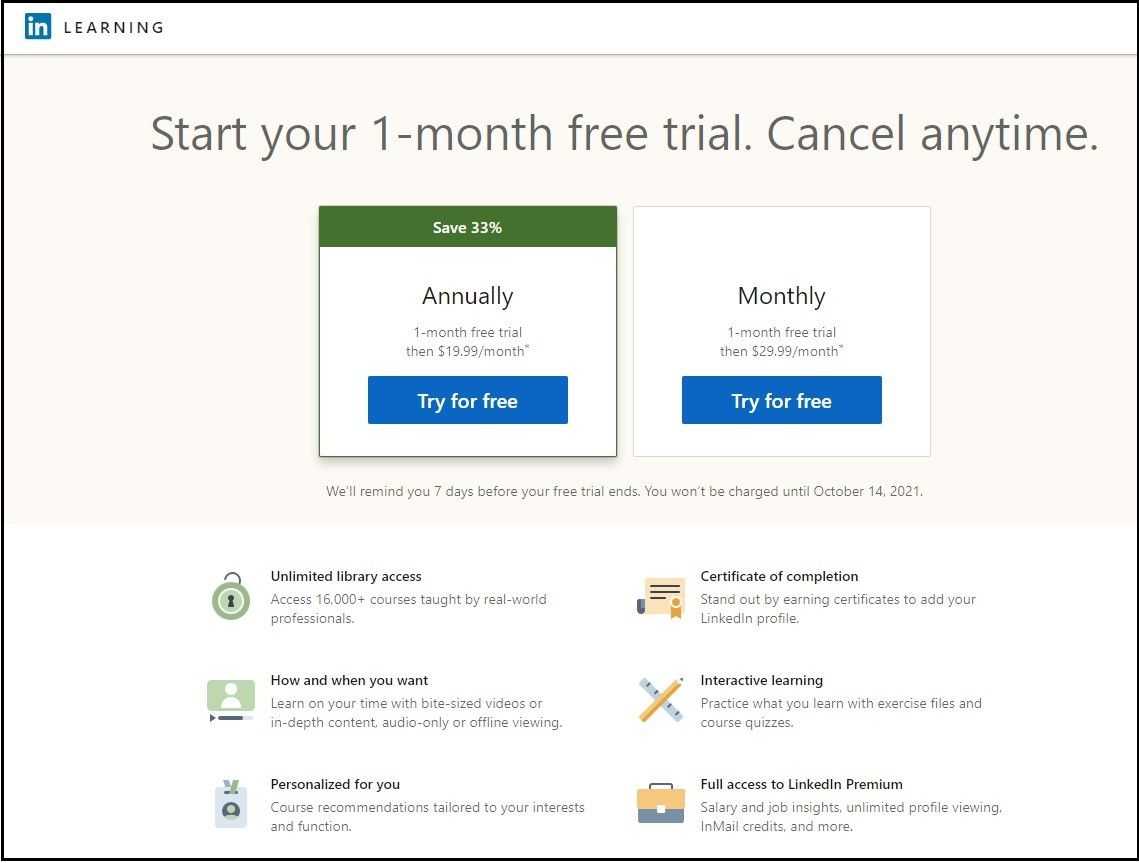 LinkedIn Learning courses are priced at $20 to $50 for lifetime access to a single course. Or, you can use the subscription route by paying $29.99 for monthly access to thousands of courses or a yearly subscription of $239.88 priced at $19.99 per month.
