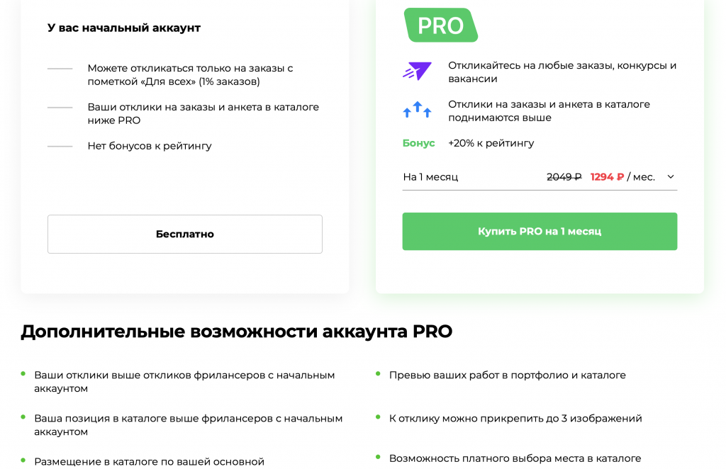 На этой бирже, конечно, тоже есть система рейтингов. И заказчики предпочитают отдавать свои деньги только тем фрилансерам, у которых есть значок «PRO». Самое смешное, что получить этот значок очень просто. Не надо годами выполнять разные задания. Можно просто заплатить 1294 рубля, и получить этот значок к своему аккаунту на целый месяц.