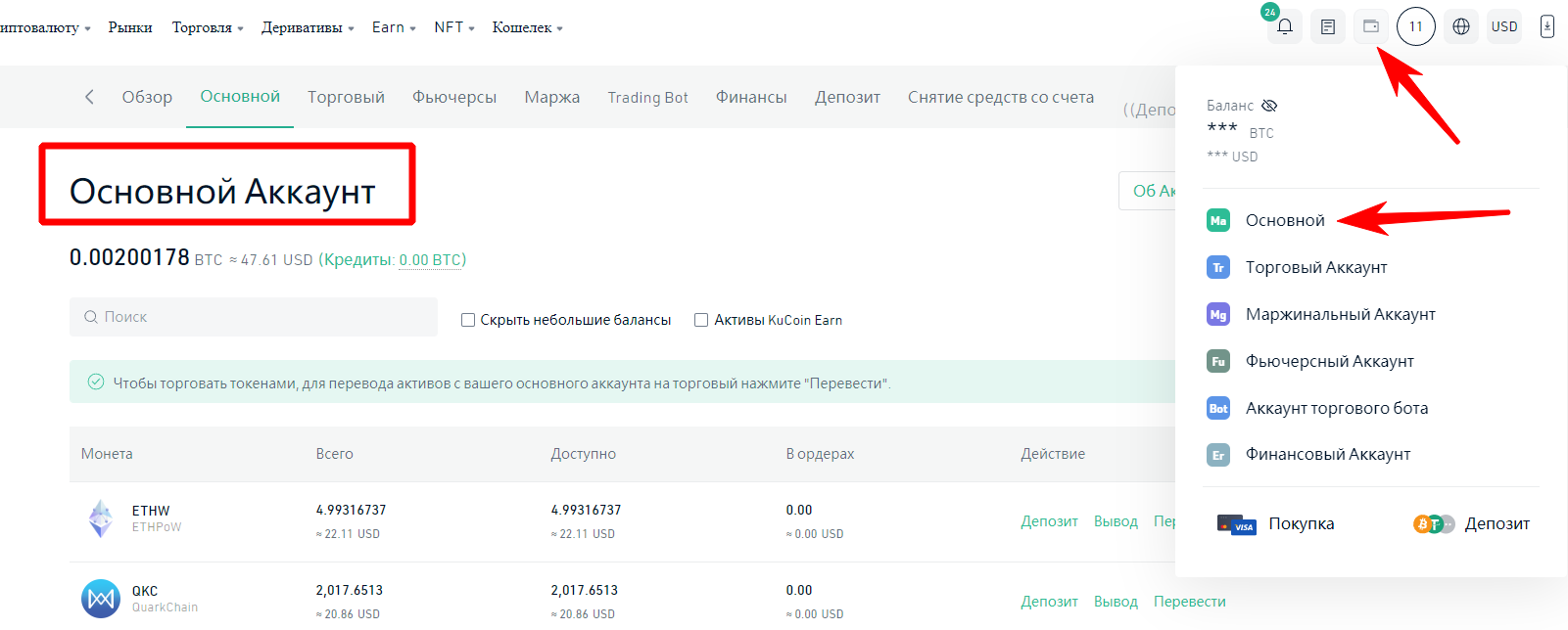 Интерфейс биржи очень простой и приятный, для ввода / вывода средств необходимо перейти в раздел кошелька. Для этого наводим на кошелек и нажимаем на кнопку «Основной». После этого Вы попадете в раздел Ваших монет, где Вы можете вывести монеты или пополнить баланс.