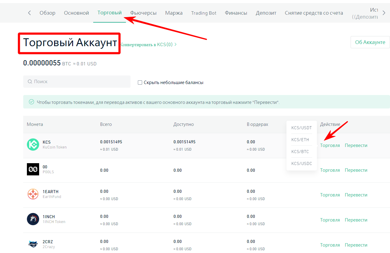 Для торговли монеты необходимо переводить в «Торговый Аккаунт» — это занимает пару секунд (и по началу кажется не удобным), но к этому быстро привыкаешь. Далее необходимо нажать на кнопку «Торговля» и выбрать нужную для Вас пару.