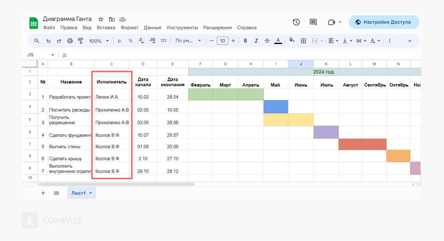 Напротив действий прописывают их исполнителей или ответственных. Это зависит от того, как построена работа в компании. В нашем случае все действия по строительству курирует прораб, за разработку проекта ответственен архитектор, а за документы и расчет расходов — помощник. Вносим эти данные в таблицу.