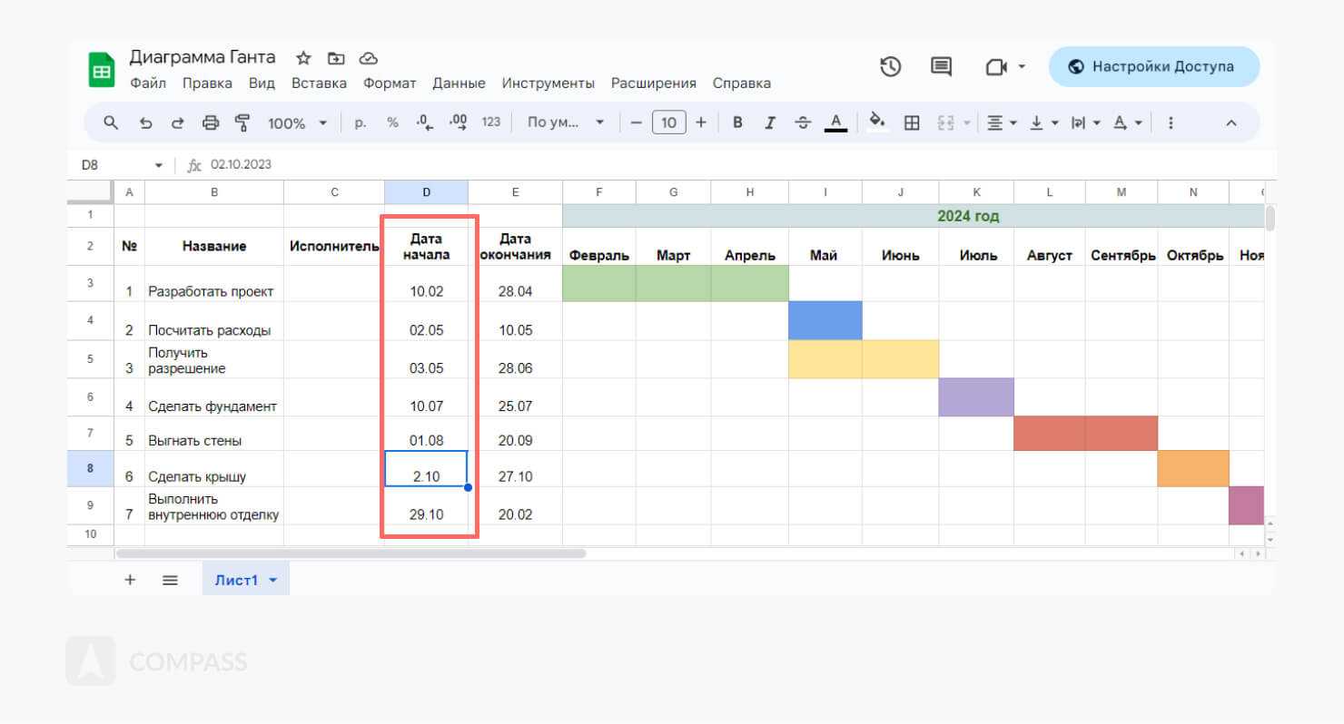 Вехи — совокупность действий, от которых зависит длительность всего проекта. В нашем случае таким действием является получение разрешения. Если этот процесс затянется, придется двигать все этапы строительства. Вехи, как и зависимости, — это специальная функция в онлайн-сервисах. В таблицах добавление вех невозможно реализовать.