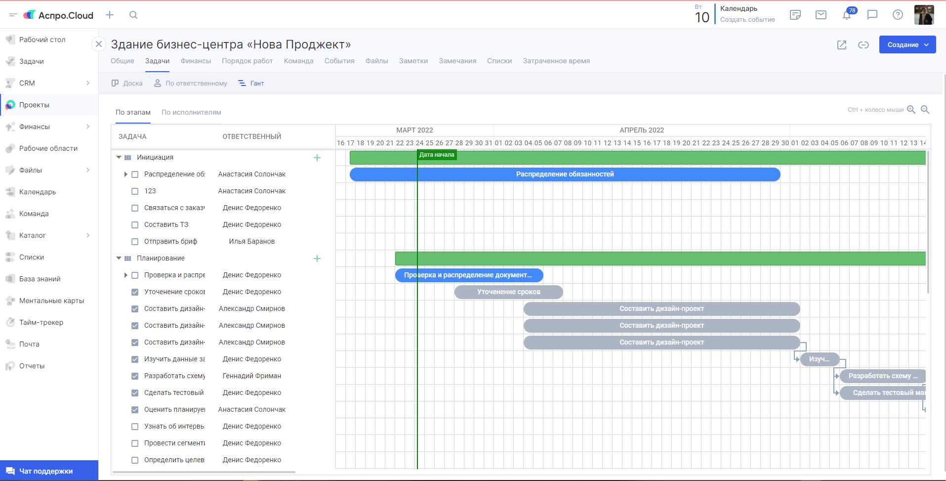 Посмотрим, как выглядит диаграмма Ганта в CRM-системе Аспро.Cloud: