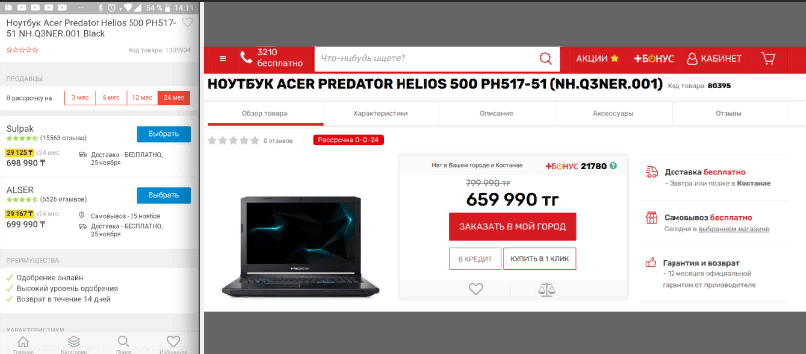 У маркетплейса стоит отметить ответственный подход к подготовке мультимедийного контента — именно фото и видео делают товары привлекательными для покупки. Карточки товаров также информативны и их можно использовать как референс: присутствуют фото, видеообзоры, блок с характеристиками и отзывами, а еще — предложения в разных магазинах сразу под главной информацией о продукте, где помимо цен указаны сроки доставки и рейтинг. Есть возможность оформить кредит. Исчерпывающе? Конечно!
