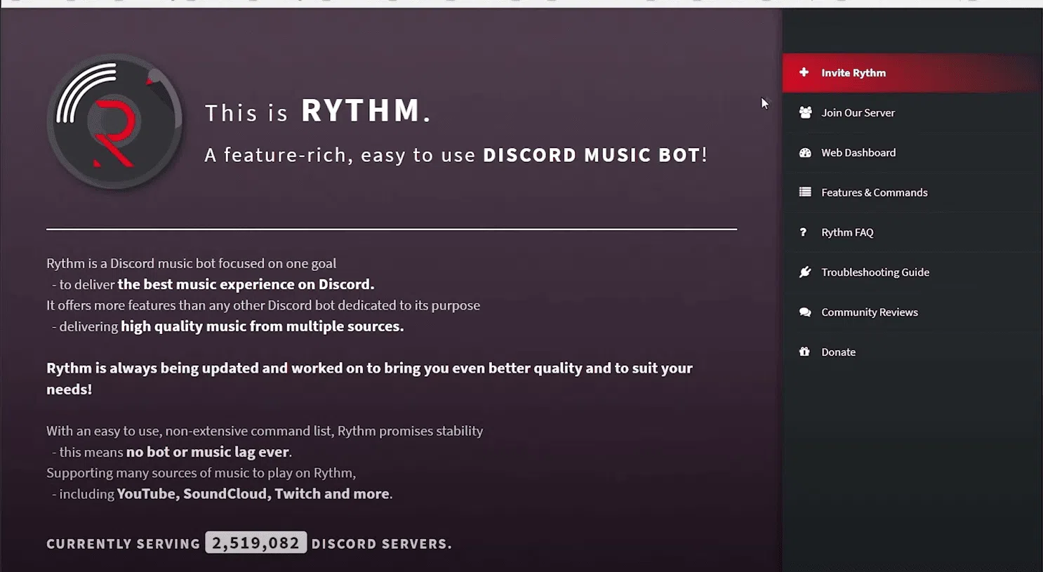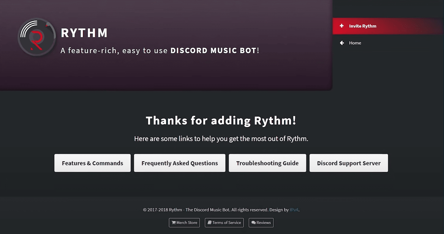 - Вы можете пригласить бота на официальной домашней странице Rythm, нажав кнопку «Пригласить бота».