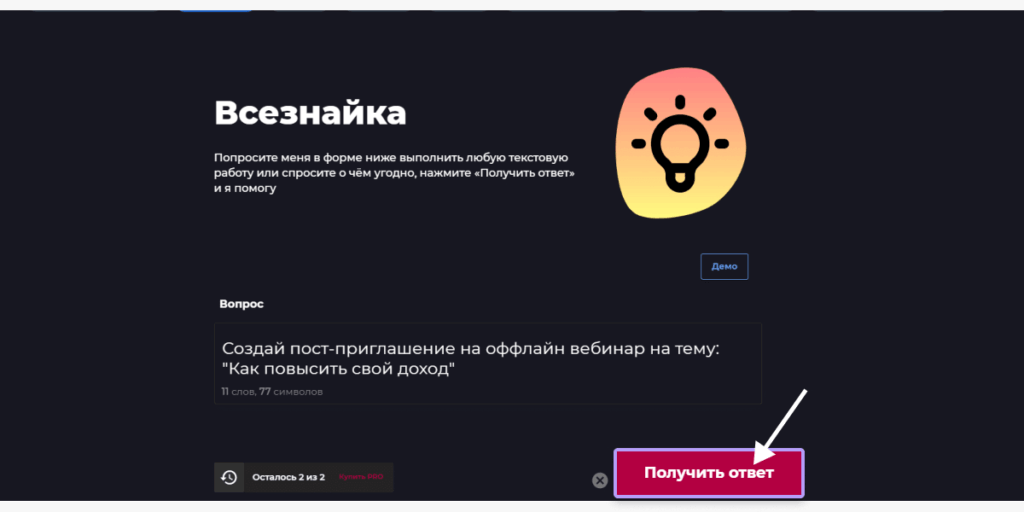 В режиме «Всезнайка» можно задать вопрос нейросети и получить на него ответ